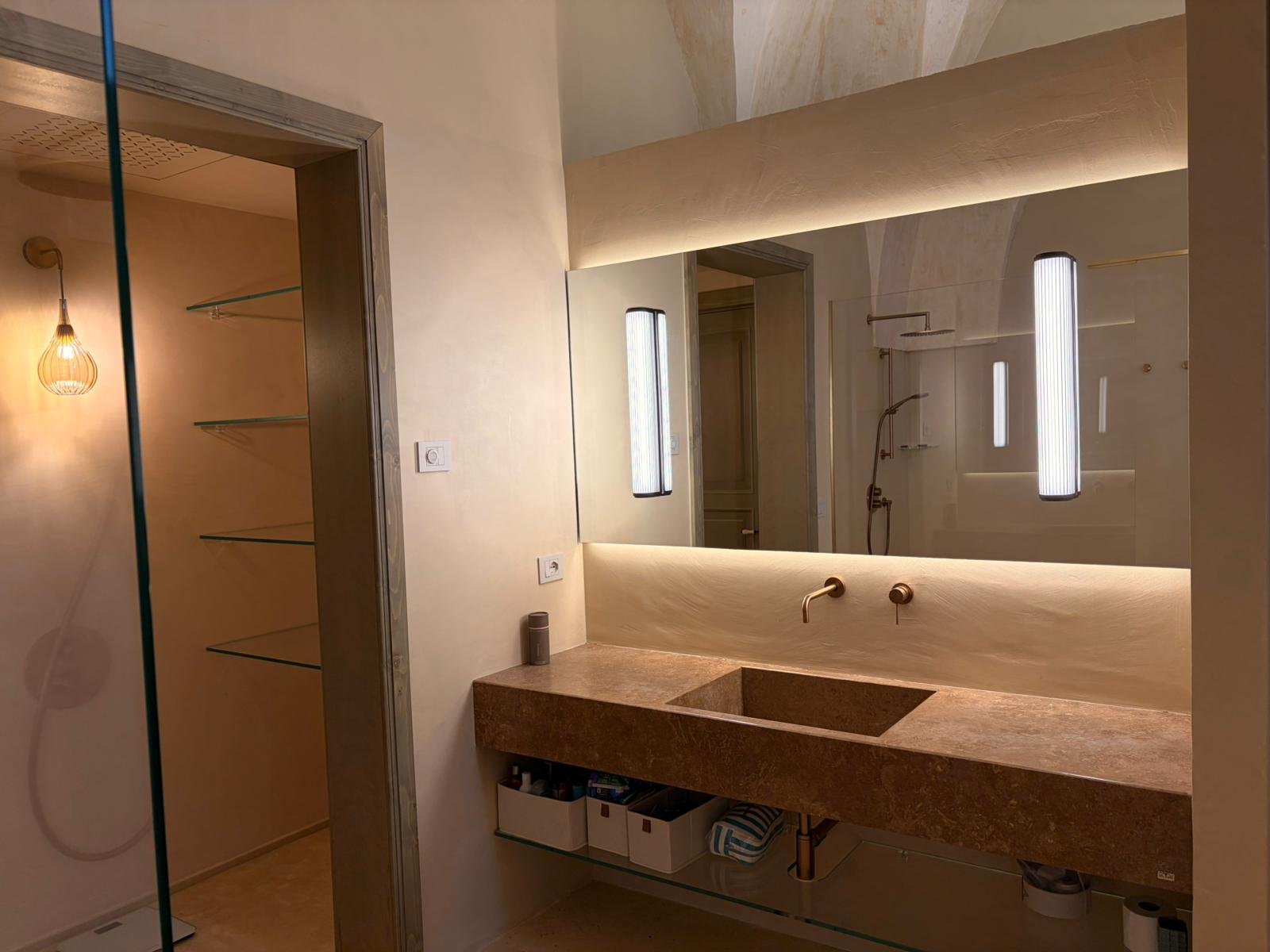 The en-suite bathroom, spanning over 260 sq. ft., is as large as two rooms. It features restored vaulted ceilings, natural stone finishes, and an oversized walk-in shower with panoramic views of the surrounding farmland and olive trees. The Suite has flat-screen TV, and built-in closet.