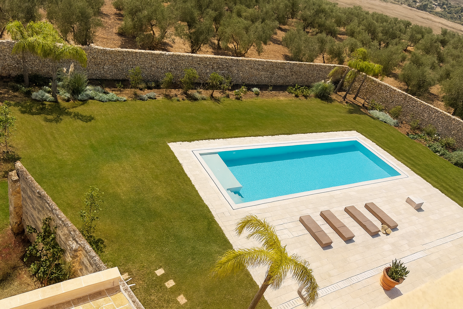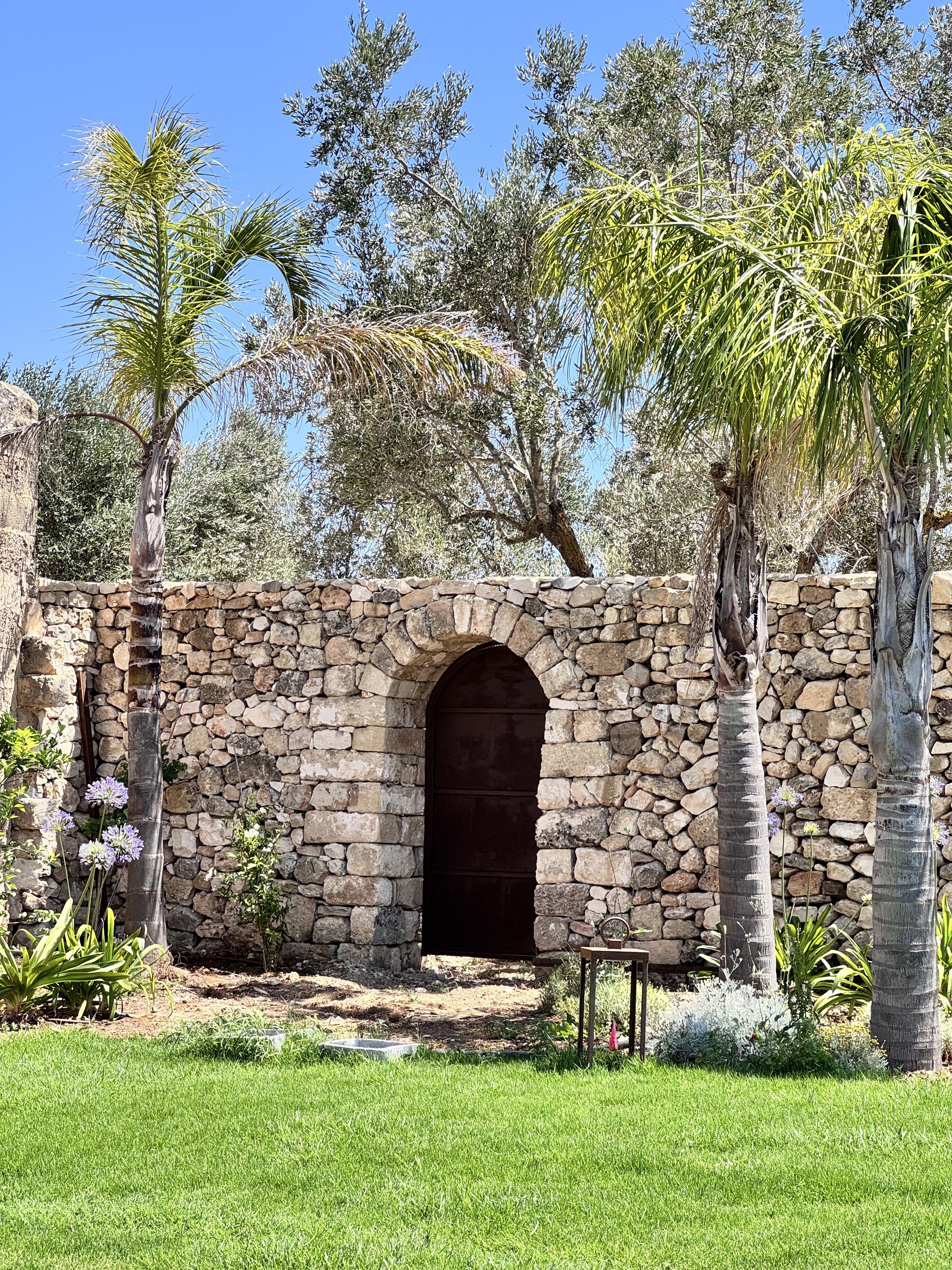 At the heart of the Masseria lies the swimming pool, a tranquil centerpiece surrounded by palm trees, pomegranate bushes, and Mediterranean blooms. The pool’s limestone edges reflect the soft Apulian light, changing hues throughout the day.